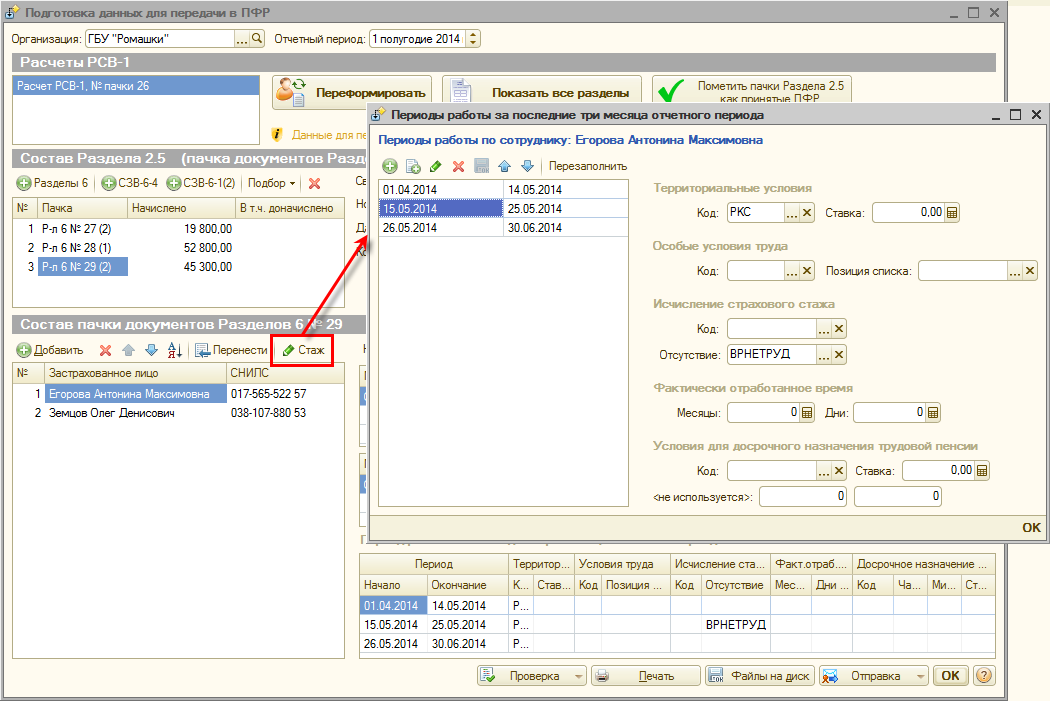 Для повышения удобства работы в таких случаях реализована кнопка «Стаж», которая позволяет в отдельной форме открыть, проверить и при необходимости отредактировать сведения о стаже выбранного сотрудника.