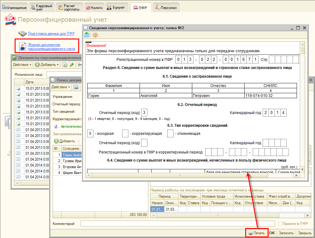 Для поддержки возможности быстрой и беспроблемной печати сведений в таких случаях в документах «Пачка документов Раздела 6 Расчета РСВ-1» реализована возможность получения печатных форм для выдачи сотрудникам. Согласно порядку формирования отчетности, в одну пачку могут входить сведения не более чем о 200 застрахованных лицах, поэтому печать такого относительно небольшого объема сведений, как правило, не вызывает трудностей.