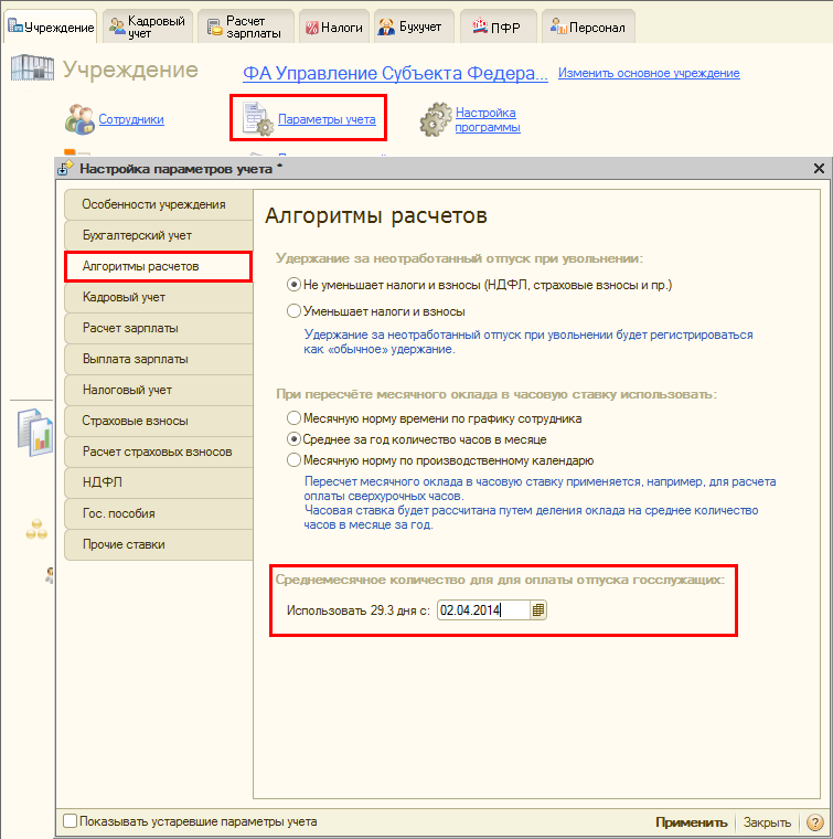 Дату следует указать в настройках параметров учета на закладке «Алгоритмы расчетов». Настройка доступна, только если в программе ведется расчет денежного содержания государственных гражданских служащих.