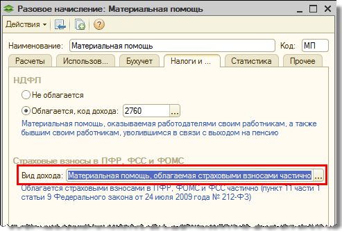 Для исправления этой ошибки следует для начисления изменить вид дохода с точки зрения страховых взносов – указать, что оно облагается взносами как материальная помощь.