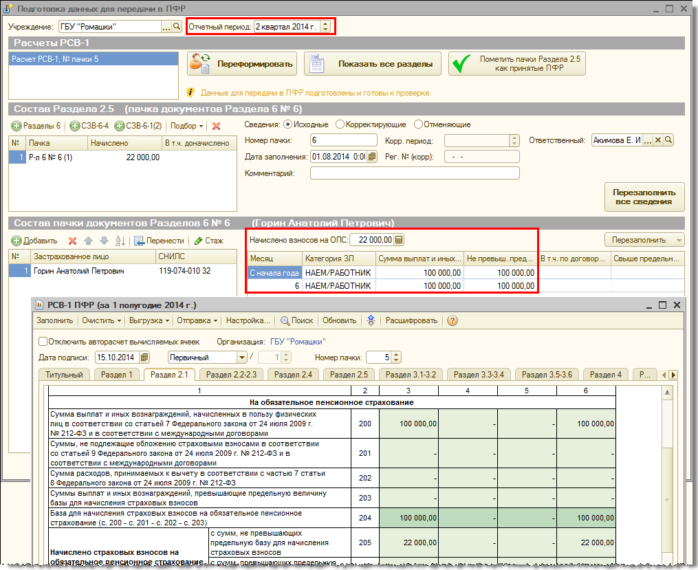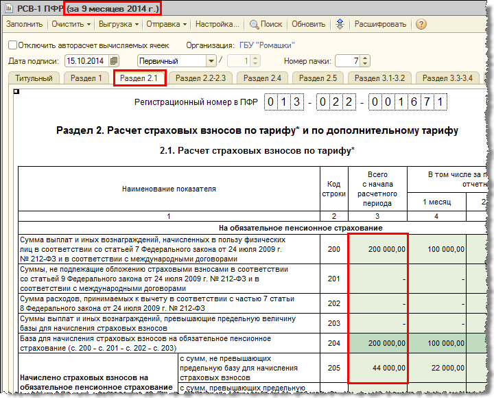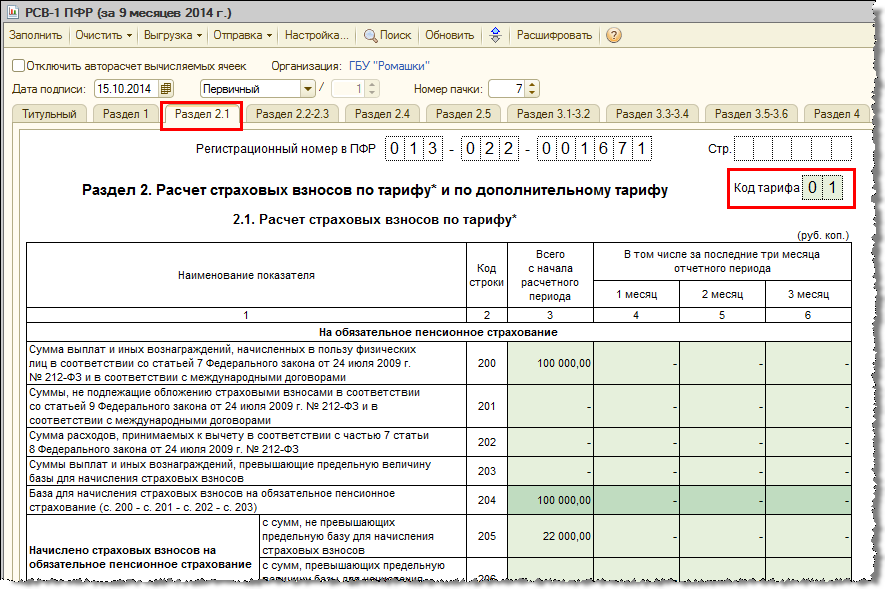 Во втором квартале сотруднику был начислен оклад 100 00 руб., взносы были рассчитаны по основному тарифу (код тарифа 01). Взнос в ПФР составил 22 000 руб.