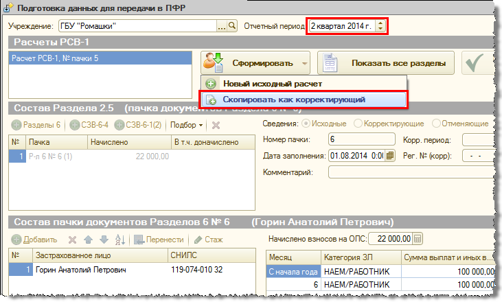 Для его формирования следует в уже отмеченном как принятый в ПФР отчете за 2 квартал выбрать вариант Скопировать как корректирующий.