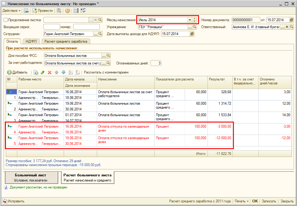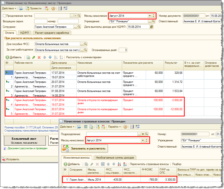 Если больничный пришелся на отпуск в рамках одного квартала, то перерасчеты будут учтены при формировании отчетности за этот квартал. Отрицательные суммы будут автоматически отнесены к месяцу, в котором был начислен соответствующий доход.
