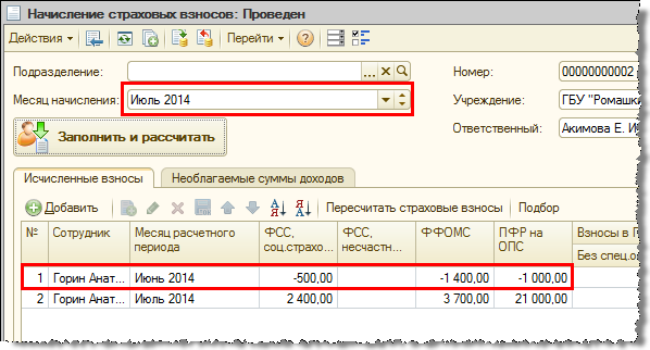 Можно указать дату регистрации изменений, относящуюся к месяцу третьего квартала (июлю) – т.е. тогда, когда действительно была выявлена ошибка. Конкретный день месяца при этом не важен. При расчете взносов в этом месяце будет доначислена отрицательная сумма взносов за июнь. В рассматриваемом примере в июле также был начислен оклад в размере 100 000 руб.