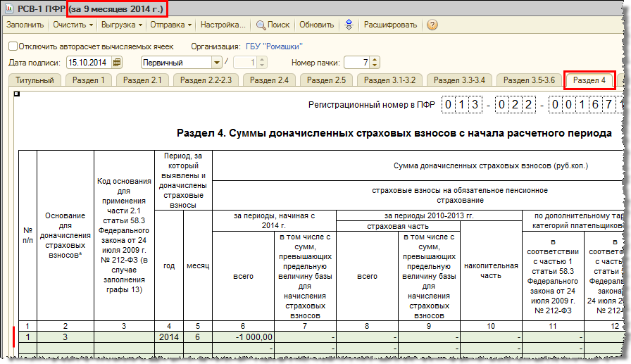 Обращаем внимание, что в случае заполнения раздела 4 соответствующие суммы взносов и доходов при заполнении разделов 1 и 2, а также исходных разделов 6 не учитываются. Т.е. в этих разделах суммы с начала года будут показаны без учета исправлений ошибок прошлых периодов.