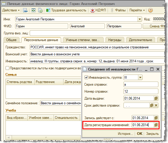 В третьем квартале выяснилось, что по сотруднику имелась справка об инвалидности, действующая с июня. Учреждение в июне имело право взносы за этого сотрудника рассчитывать по пониженному тарифу. В программе регистрируются сведения об этой справке, действующие с июня.