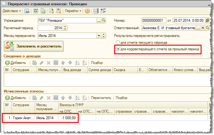 В зависимости от того, каким из рекомендуемых ПФР способов требуется отразить в отчетности это исправление, в документе выбирается один из вариантов регистрации результатов перерасчета: