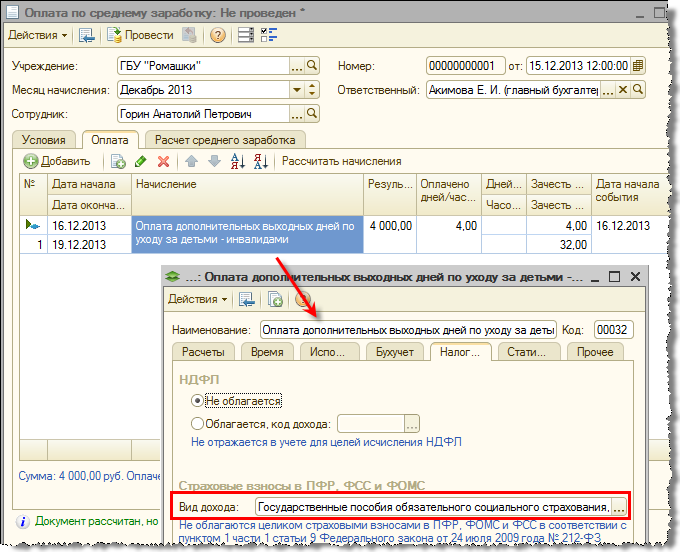 В 2013 году сотруднику была начислена оплата дополнительных выходных дней по уходу за детьми-инвалидами в размере 4 000 руб. Было принято решение не облагать ее страховыми взносами. Отметим, что вопрос обложения взносами оплаты таких дней является спорным. ФСС в своих письмах рекомендует такие начисления облагать взносами, однако имеются постановления судов, в которых установлено, что они не подлежат обложению.