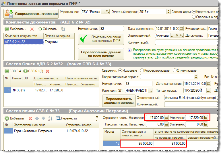 Кроме того, был начислен облагаемый доход в размере 81 000 руб. Взнос в ПФР на страховую часть пенсии составил 17 820 руб. Была сформирована и представлена отчетность в ПФР за 2013 год.