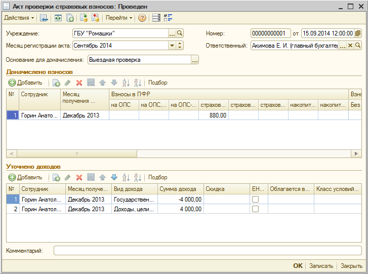 Доначисления по результатам камеральной или выездной проверки можно зарегистрировать новым документом Акт проверки страховых взносов. Помимо сведений, указанных непосредственно в акте, документом можно отразить сторнирование доходов с неверным видом. Это позволит сформировать отчетность автоматически, без внесения в нее изменений вручную.