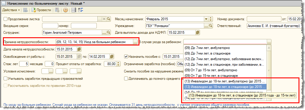 До 2015 года пособие по временной нетрудоспособности выплачивалось в связи с уходом за тяжелобольными детьми в возрасте до 15 лет. С 2015 года Федеральным законом (проект) предельный возраст увеличен до 18 лет. В связи с этим в версии 1.0.78.2 в документе «Больничный лист» уточнены наименования случаев ухода.