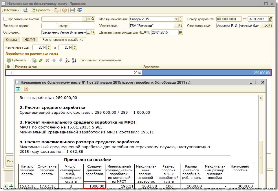 Рассчитывается обычный больничный в 2015 году, заработок за 2014 год составил 289 000 руб. Средний дневной заработок будет равен 1 000 руб. (289 000 руб./289)