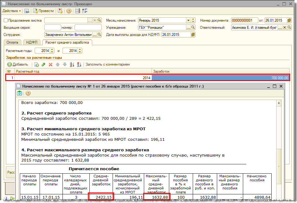 Если же заработок за 2014 год составил 700 000 руб., то средний дневной заработок будет равен 2 422,15 руб. (700 000 руб./289) и поэтому в расчет будет принят в размере ограничения 1 632,88 руб.