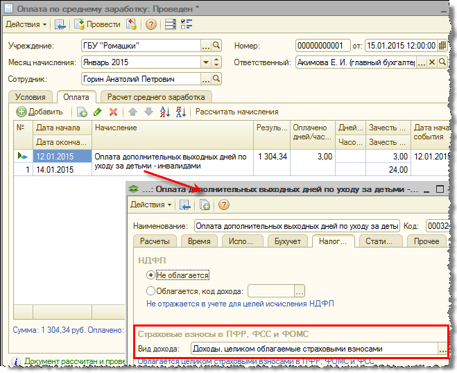 В январе 2015 года сотруднику была начислена облагаемая взносами оплата дополнительных выходных дней по уходу за детьми-инвалидами в размере 1 304,34 руб.
