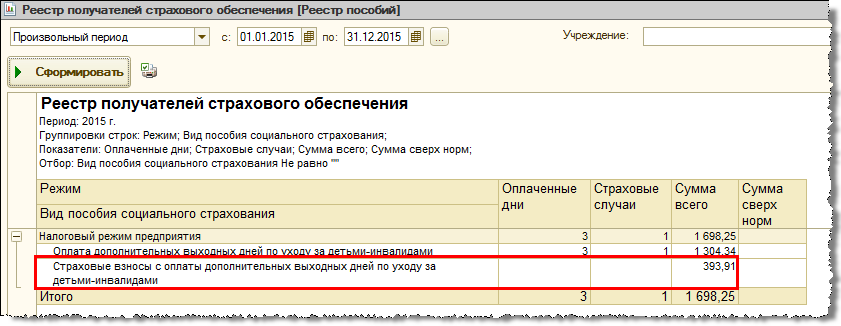 В связи с этим в версии 1.0.78.2 реализовано отражение страховых взносов, начисленных с оплаты дней ухода за детьми-инвалидами: