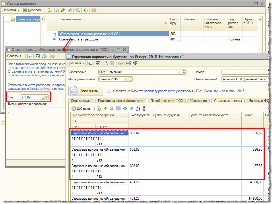 При необходимости в статье расходов «Отражается на счетах расходов с ФСС» можно указать счёт 303.02, на который будут относиться расходы на страховые взносы с оплаты дней ухода.