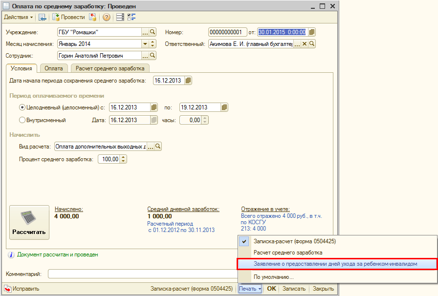 В соответствии с Приказом Министерства труда и социальной защиты Российской Федерации от 19 декабря 2014 г. № 1055н в документах «Оплата по среднему заработку» и «Сохраняемое денежное содержание» предоставлена печатная форма заявления о предоставлении одному из родителей (опекуну, попечителю) дополнительных оплачиваемых выходных дней для ухода за детьми-инвалидами.