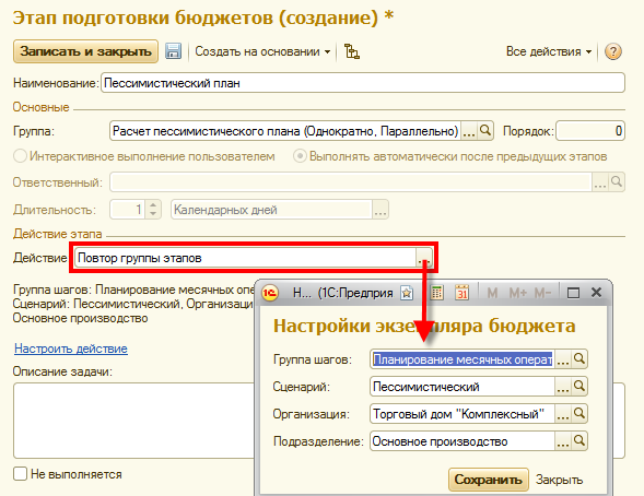 Моделирование различных сценариев в рамках одной бюджетной модели может быть осуществлено в виде цепочек повторяющихся действий, настраиваемых в рабочем месте Бюджетирование – Настройки и справочники - План подготовки бюджетов. При установке последовательности их выполнения в бюджетной модели необходимо указать для них вид действия Повтор группы. Данная настройка позволяет выбрать необходимую группу этапов для повторного расчета плановых значений, но уже с учетом измененного сценария, например, пессимистичного