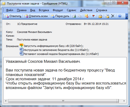 Использование E-mail оповещений и отображение вложений регулируется функциональной опцией Администрирование – Бюджетирование и международный учет – Использовать оповещения для задач бюджетирования.