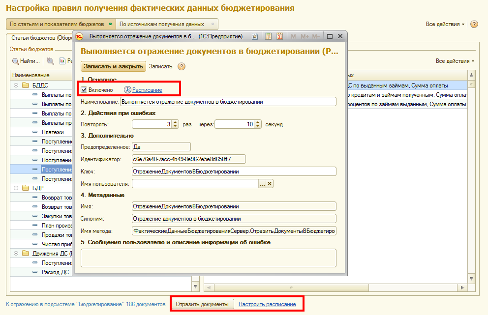 Настройка отложенного или оперативного отражения в системе бюджетных документов определяется функциональными опциями в разделе Администрирование – Бюджетирование и международный учет – Автоматически запускать фоновое задание расчета хранимых данных при проведении документов и Автоматически запускать фоновое задание расчета хранимых данных бюджетирования из отчетов.
