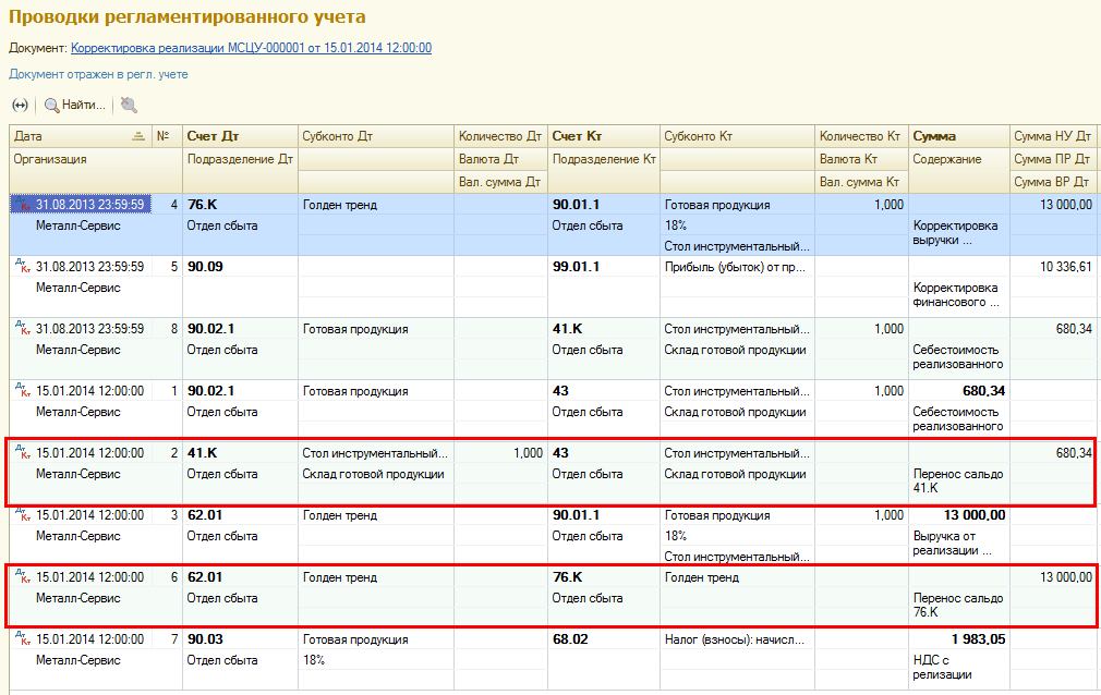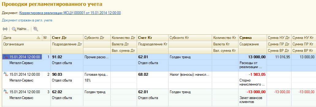 На основании документа реализации прошлого отчетного периода создается документ Корректировка реализации. Необходимо уменьшить сумму реализации прошлого отчетного периода. После процедуры закрытия месяца проводки по созданному документу будут иметь следующий вид: