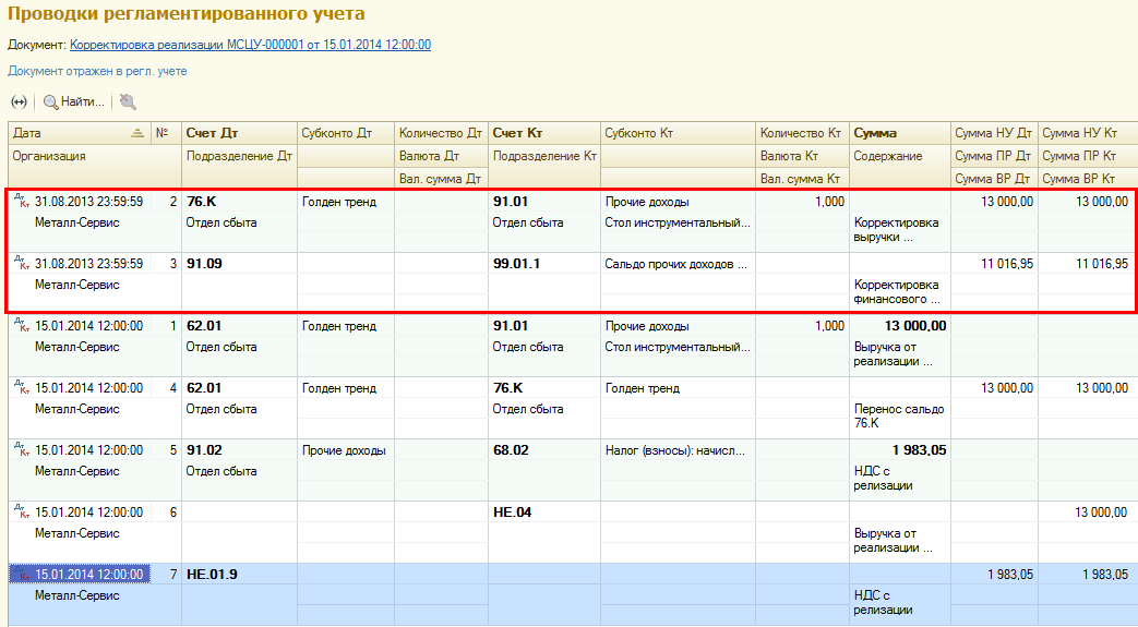 Проводки по налоговому учету оформляются отчетным периодом, в котором был создан исходный документ реализации. Это позволяет сформировать исправление к декларации по налогу на прибыль прошлого отчетного периода. Суммы отражаются исключительно в рамках налогового учета без формирования временных и постоянных разниц. Для отражения используется вспомогательный счет 76.К «Корректировка расчетов прошлого» (задается автоматически), с помощью которого фиксируется возникновение дополнительной выручки от клиента.