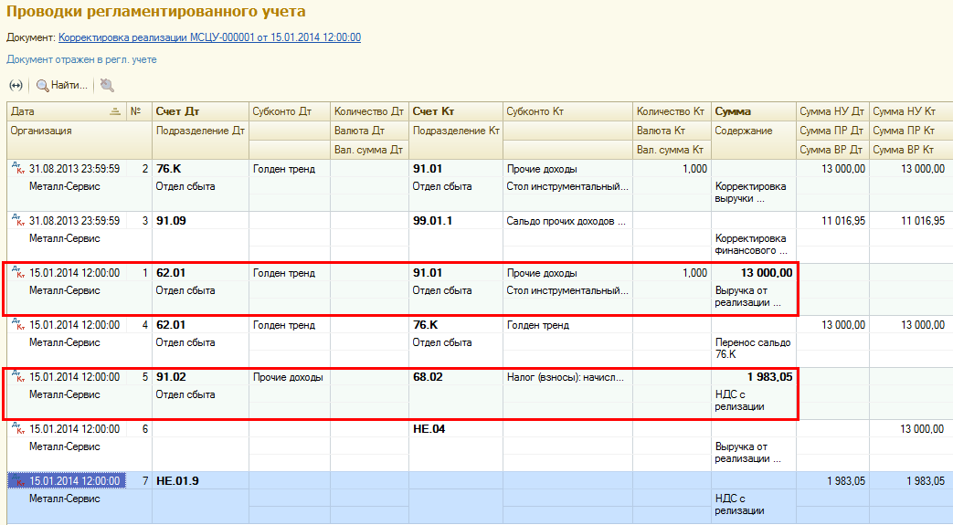 На основании документа реализации прошлого отчетного периода создается документ Корректировка реализации. Необходимо увеличить сумму реализации прошлого отчетного периода. После процедуры закрытия месяца проводки по созданному документу будут иметь следующий вид: