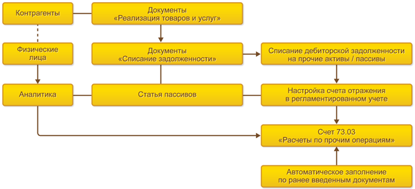 Перенос задолженности со счета 62 «Расчеты с покупателями и заказчиками» на счет 73.03 «Расчеты по прочим операциям (с сотрудниками)» выполняется документами Списание задолженности с типом операции Списание дебиторской задолженности на прочие активы/пассивы. Для переноса задолженности используются статьи пассивов с аналитикой по физическим лицам (список Физические лица). Счета учета задолженности определяется непосредственно в шапке документа. Его значение может заполняться автоматически на основании данных ранее введенных документов указанного типа.