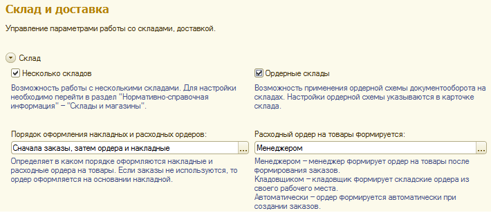Реализовано несколько схем работы. Использование той или иной схемы работы определяется установленными функциональными опциями Порядок оформления накладных и расходных ордеров и Расходный ордер на товары формируется в разделе Администрирование – Склад и доставка.