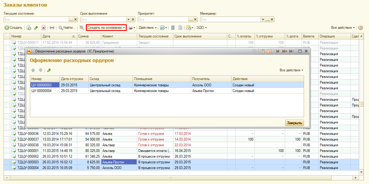 Расходный ордер оформляется менеджером. Расходный ордер может быть оформлен путем ввода на основании заказа или накладной. Для строк, которые необходимо отгрузить, в заказе должно быть установлено действие Отгрузить. Если используется схема работы с выпиской финансовых документов, то документ Расходный ордер на товары на основании заказа может быть создан только после оформления накладных (финансовых документов)Документ Расходный ордер на товары оформляется из списка заказов путем ввода на основании. Предусмотрена возможность пакетного оформления документов по нескольким заказам.
