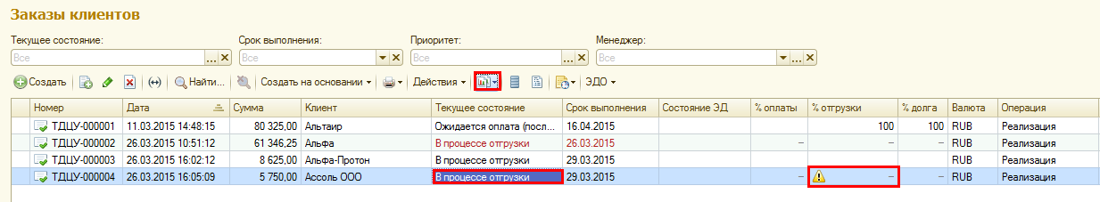 В колонке Процент отгрузки добавлена иконка, отображающая расхождение между отгрузкой в ордере и оформлением в накладной.