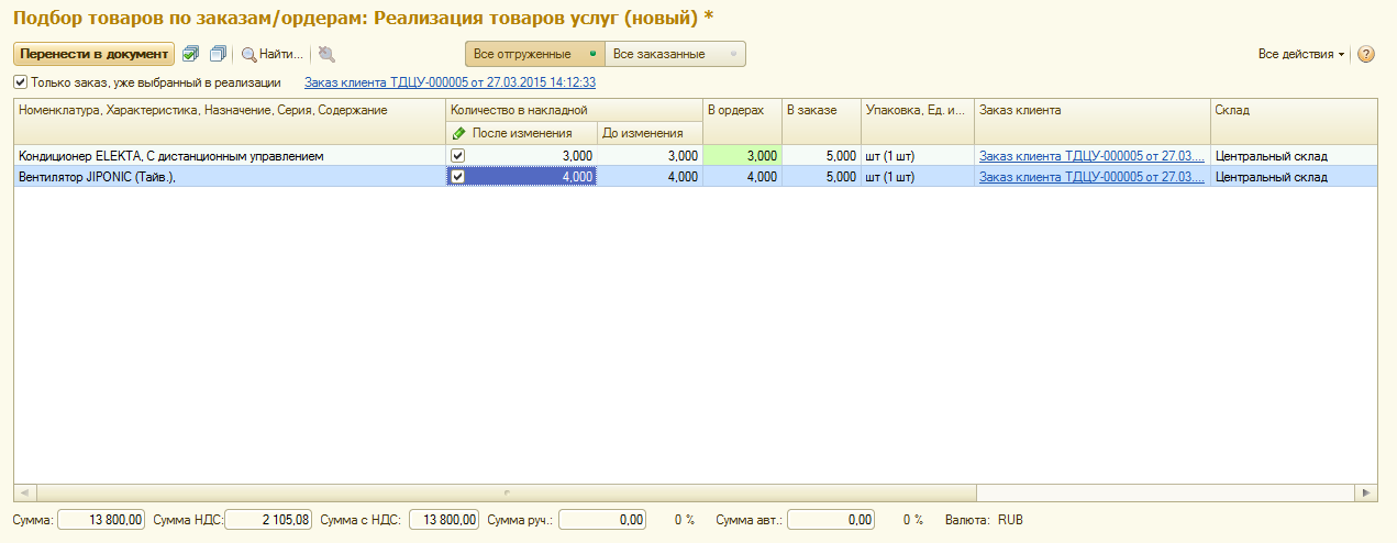 В зависимости от установленного в настройках варианта отгрузки по заказам, данный сервис заполняет подобранное количество по заказам, либо по ордерам. Менеджеру доступно переключение данного режима в самом подборе, а также редактирование подобранного количества вручную. При совпадении количества в заказе, ордере и в накладной строка исчезает из подбора.