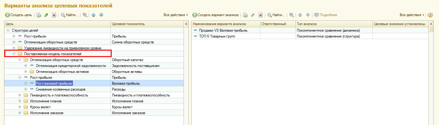 В ранее созданной информационной базе новая поставляемая модель будет загружена в отдельную группу показателей Поставляемая модель показателей. При этом все ранее используемые показатели останутся в справочнике Варианты анализа целевых показателей.