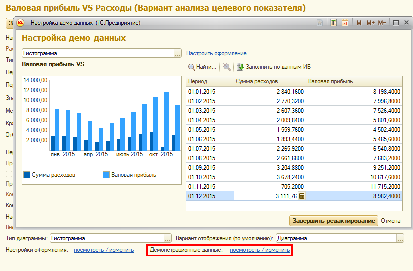 При настройке варианта анализа можно посмотреть, как будет выглядеть этот показатель в мониторе целевых показателей. Для этих целей используется команда Демонстрационные данные (посмотреть/изменить).