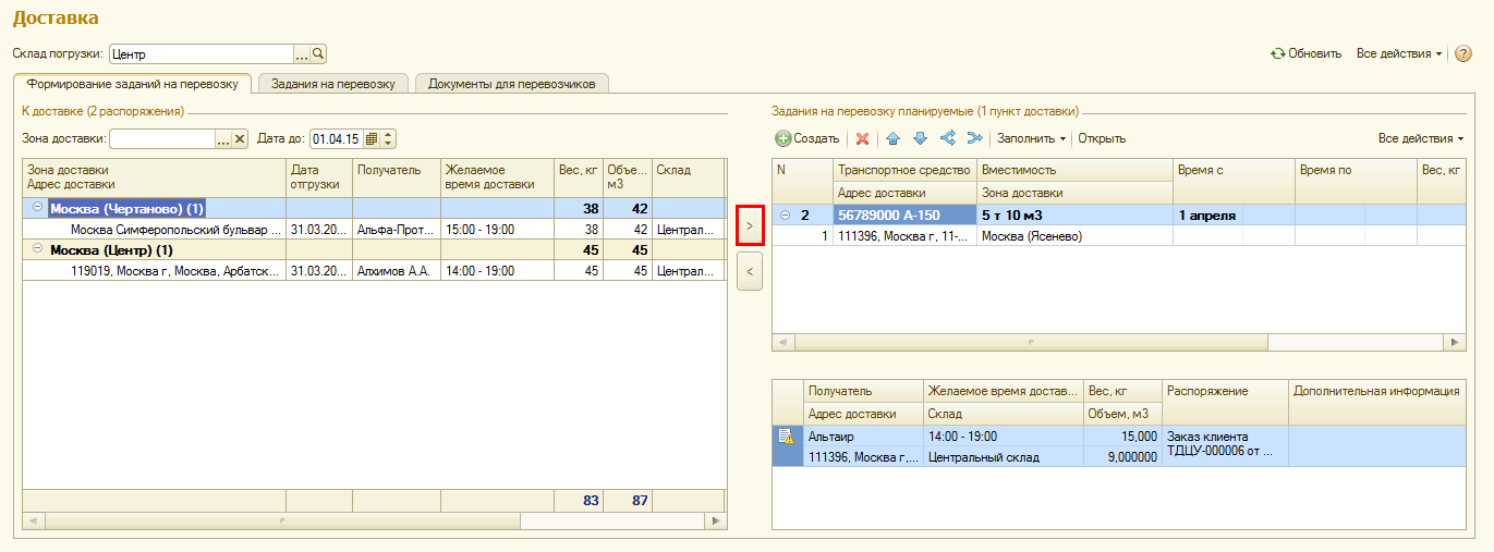 В сформированном задании на перевозку указываются заказы клиентов, по которым необходимо доставлять товары.