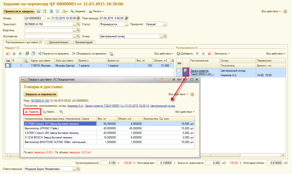 При формировании задания на перевозку может возникнуть ситуация, что товар, который нужно доставить одному или нескольким клиентам не умещается (по весу или объему) в транспортное средство и необходимо предоставить еще одно дополнительное транспортное средство или организовать дополнительный рейс. При возникновении такой ситуации можно удалить часть товара из задания на перевозку. Для этих целей в задание на перевозку добавлена возможность корректировки списка товаров к доставке.