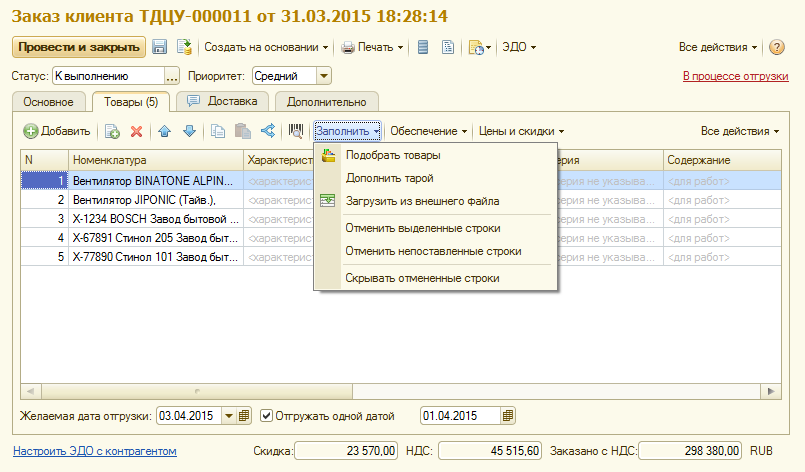После сборки товаров на складе задания на доставку могут быть перезаполнены в соответствии с количеством фактически собранного товара. Для этих целей используется команда Заполнить – По расходным ордерам на товары. После проверки собранных товаров в задании на перевозку устанавливается статус Отправлено.