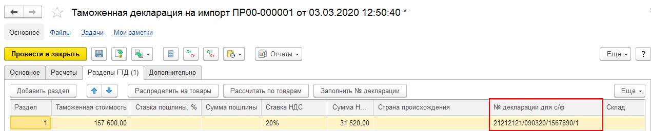 Если в декларации необходимо указать номер строки товара или номер раздела, соответствующий полю №32 таможенной декларации, то для такой возможности на закладке Разделы ГТД в табличную часть Товары декларации добавлено поле Порядковый №. По умолчанию поле не заполняется и не является обязательным к заполнению.