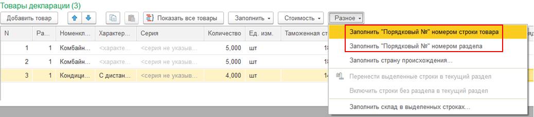 Заполнить порядковый номер можно номером строки товара или номером раздела (подменю команд Разное).