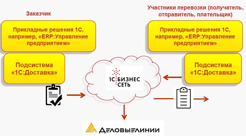 Схема взаимодействия участников грузоперевозки посредством программы 1С, сервиса «1С:Доставка» и API перевозчиков.