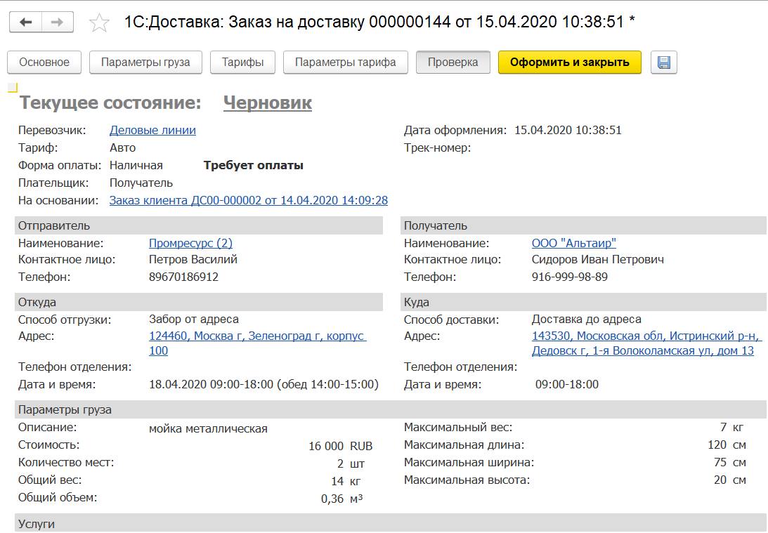 По результату применения команды Проверка будет показана вся информация по заказу на доставку (данные по тарифу, участники перевозки и контактные лица, способы и адреса доставки/отгрузки, параметры груза и др.).