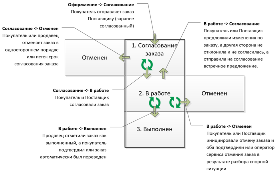Статусы сервиса, состояния заказов, доступные действия покупателя и продавца представлены на схеме.