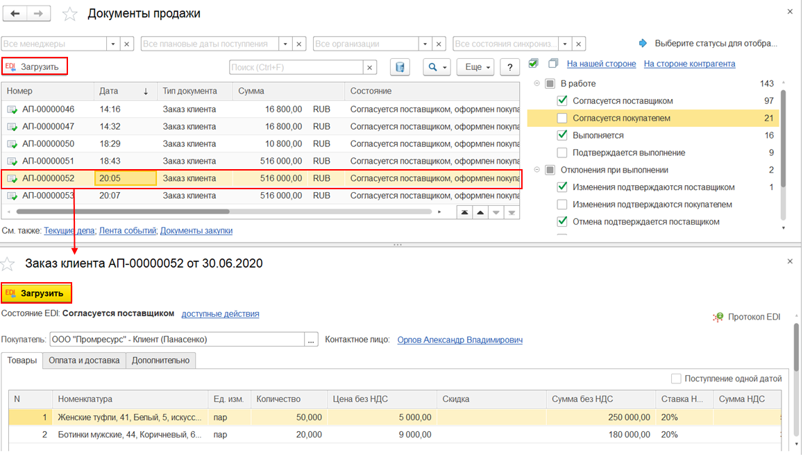 Загрузить заказ клиента в информационную базу поставщика можно по команде Загрузить на форме заказа клиента или на форме списка документов продажи 1С:EDI.