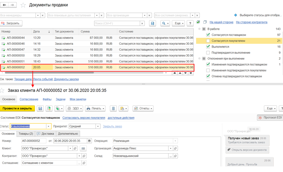 В протоколе EDI заказа клиента показывается история взаимодействия с поставщиком, при необходимости поставщик может добавить комментарий к заказу.