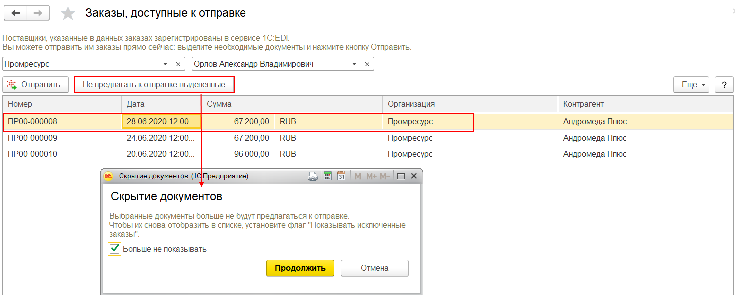 Система автоматически отслеживает, какие заказы готовы к отправке контрагентам с использованием сервиса 1С:EDI. Такие заказы показываются в рабочем месте Заказы, доступные к отправке.