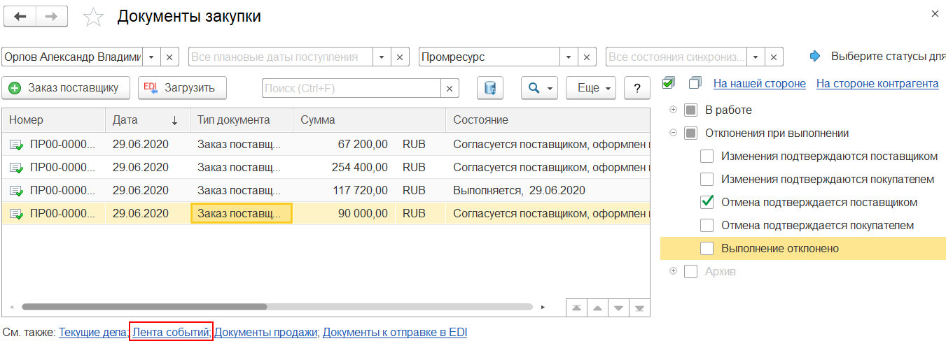 Все события (новые документы, изменение статусов, новые сообщения в протоколе EDI) показываются в ленте новостей. Лента событий позволяет быть в курсе, какие события произошли в отношении заказов в сервисе 1C:EDI (например, создан, согласован, выполнен заказ) и в каком статусе заказ.