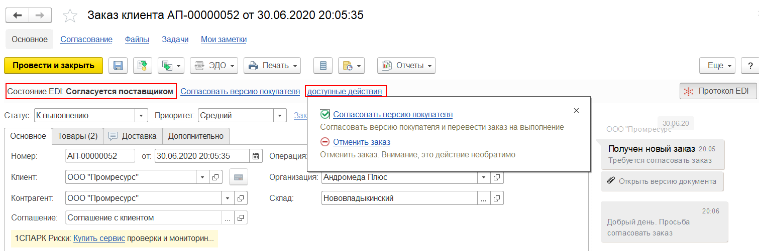 В протоколе также можно видеть информацию о том, что заказ отправлен на согласование покупателем.