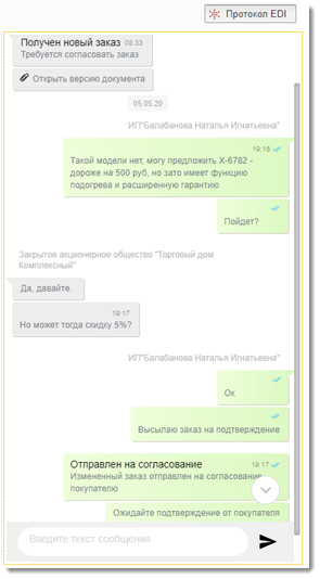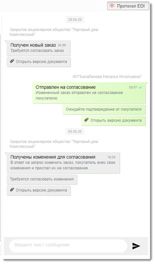 Протокол EDI отображает историю работы с документом в сервисе EDI и позволяет писать сообщения контрагенту, тем самым обеспечивая возможность обсуждения деталей по заказу.