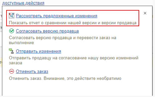 По результату отправки заказу поставщику присваивается состояние EDI Согласуется поставщиком и отображаются доступные действия, которые может выполнить пользователь в отношении заказа. В зависимости от текущего состояния доступны разные действия.