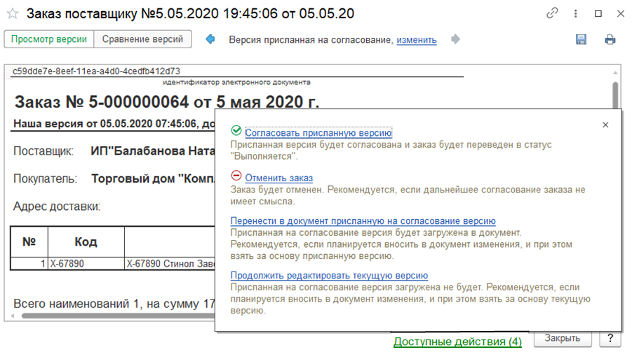 Просмотр версии заказа присланной контрагентом на согласование: